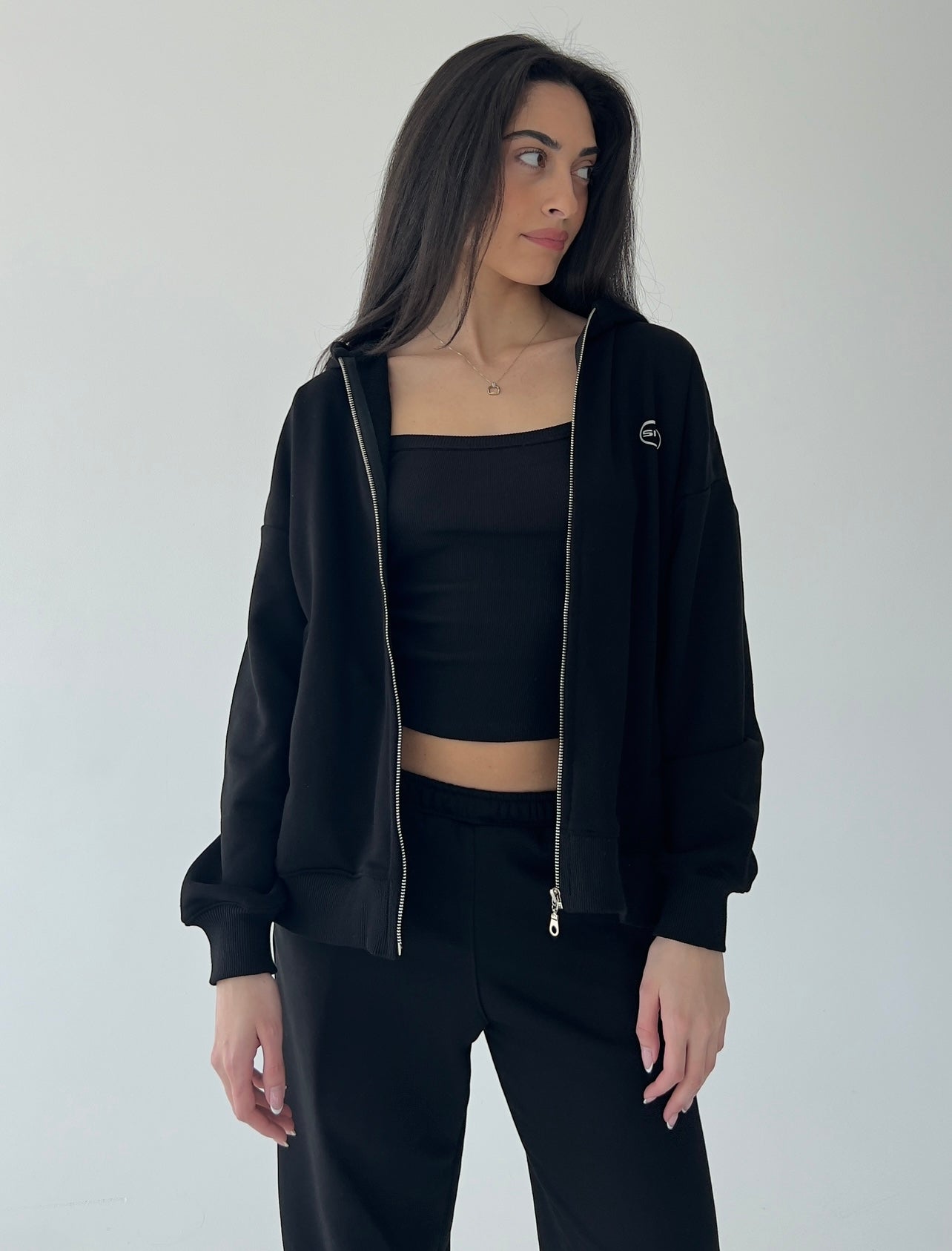 Oversized Full Zip hoodie is a comfy choice for everyday activities. Made from Organic Cotton Fleece-back fabric. Featuring dropped shoulders, graphic logo, zip front and pockets.