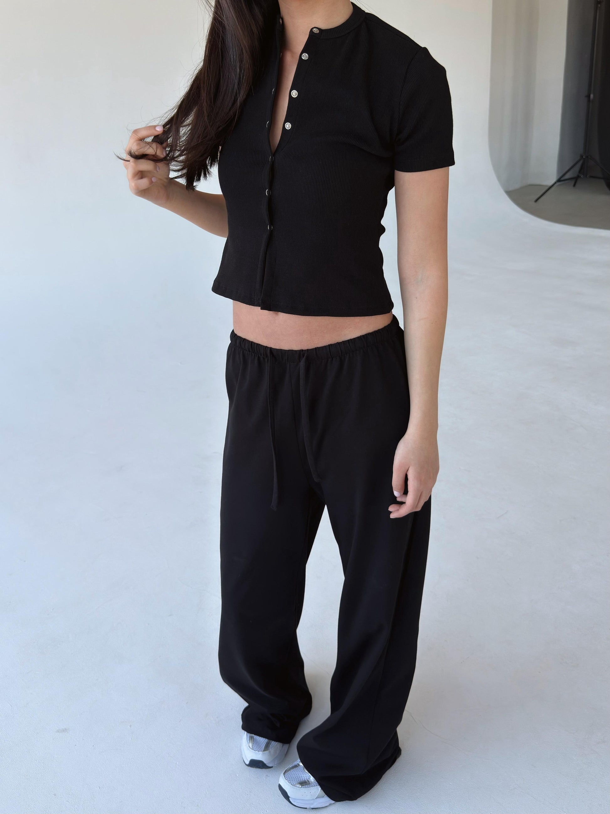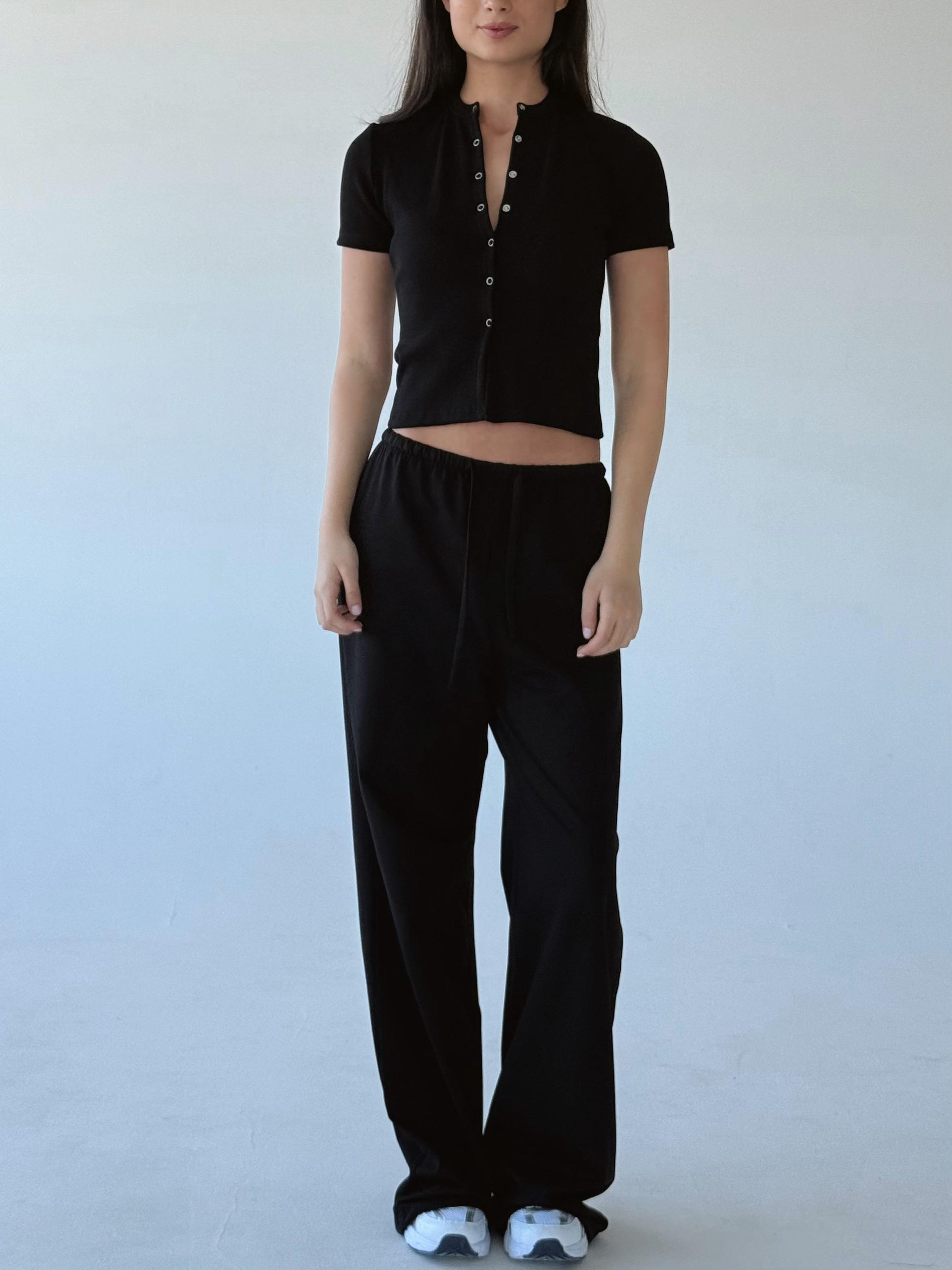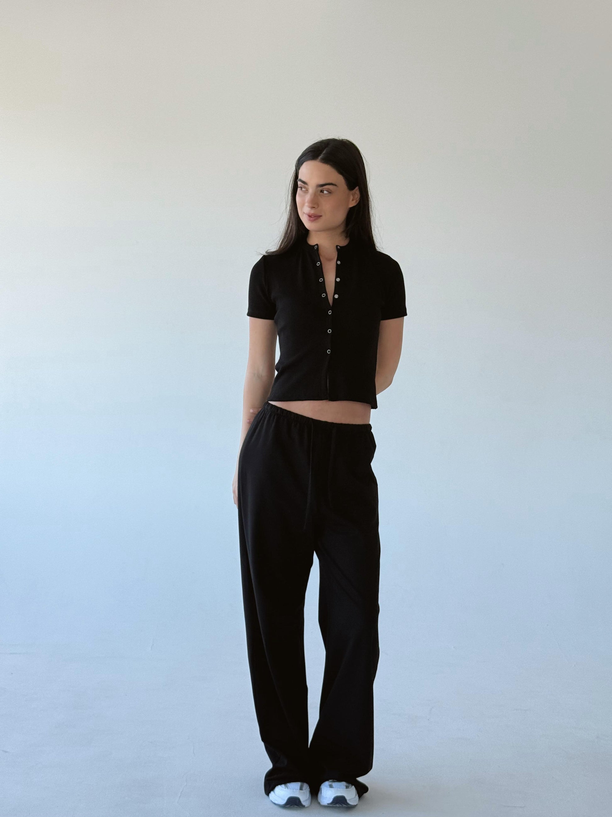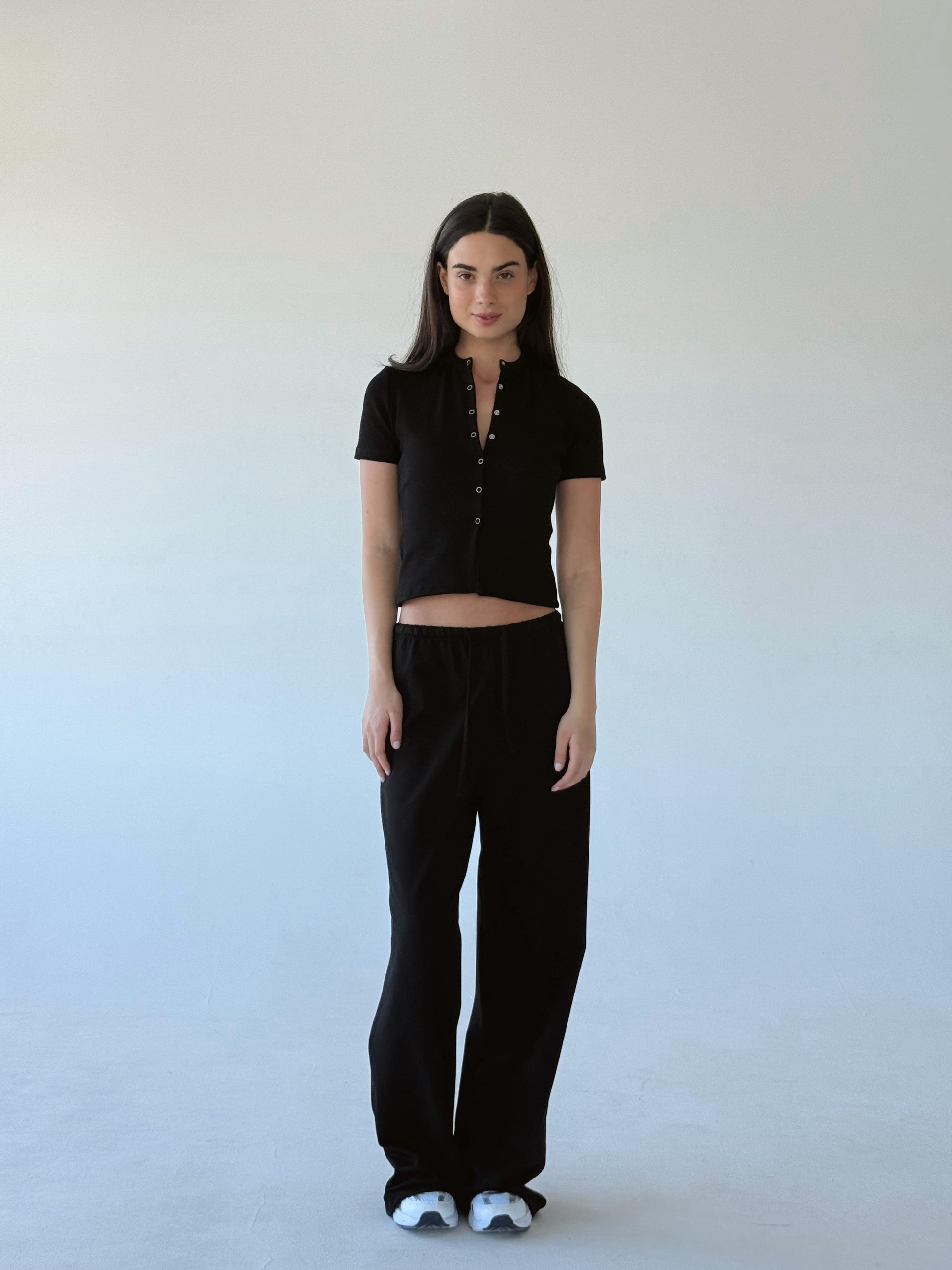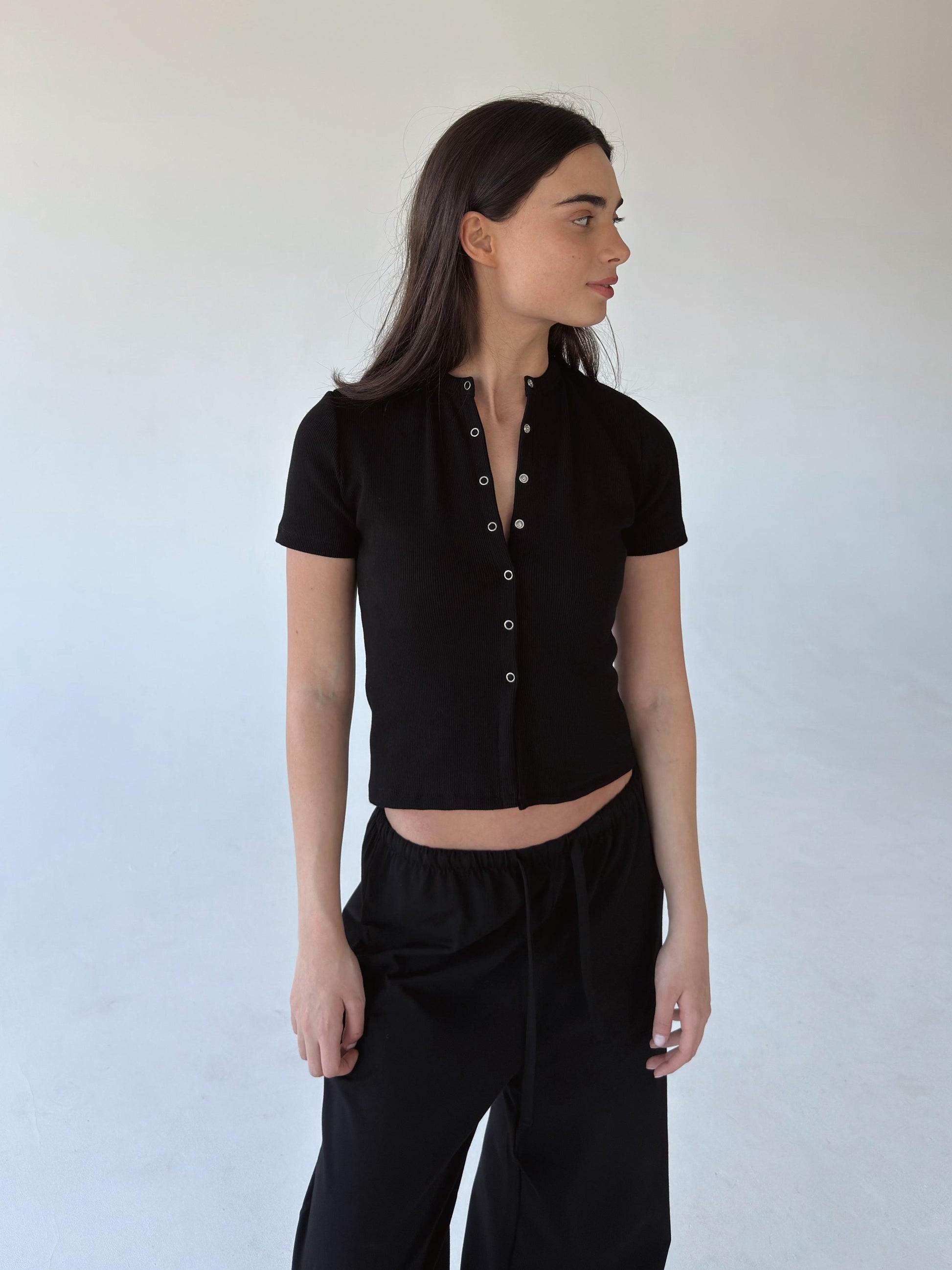 ბამბის ტოპი ღილებზე. სცადეთ მისი მორგება ჯინსებთან.