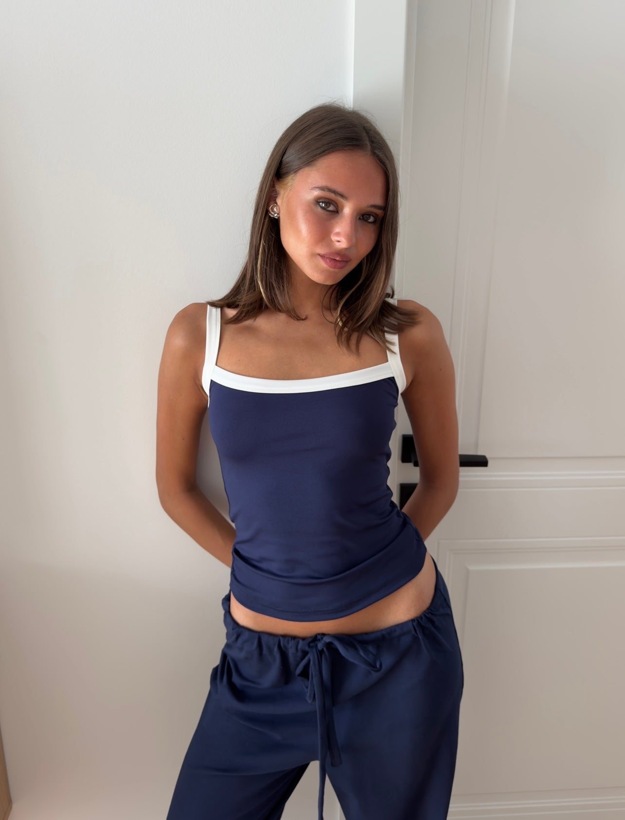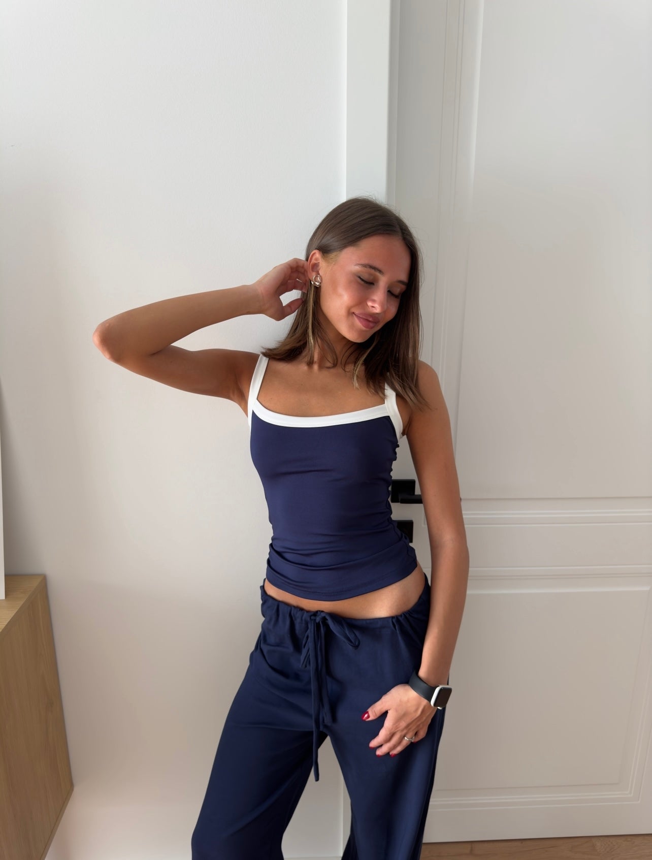 მუქი ლურჯი ბრეტელიანი ზედა თეთრი ხაზით